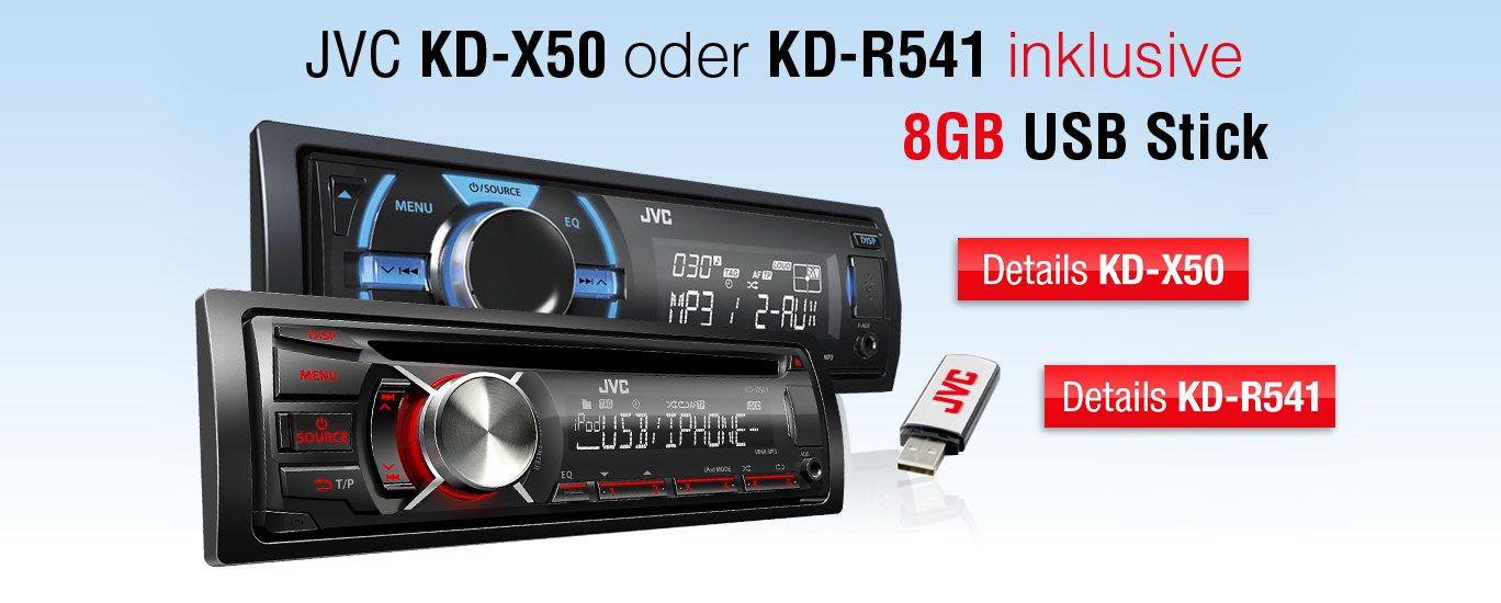 Beim Kauf des JVC KD-X50 oder KD-R541 erhalten Sie einen 8GB USB-Stick zugeschickt. Einfach das Aktionsformular herunterladen und zusammen mit einer Kopie der Rechnung per Mail oder Post an JVC senden. Gültig bis 31.10.2013. Einsendeschluss ist der 15.11.2013. Alle weiteren Informationen sowie die Aktionsbedingungen finden Sie unten.